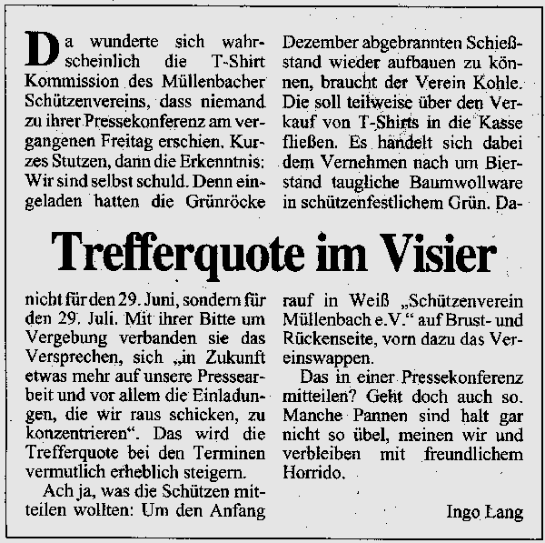 Als vor sieben Jahren ein paar Jungschützen mit selbstgemachten T-Shirts auf dem Fest herum marschierten, ahnte noch niemand etwas von dem frisch entwickelten Kultobjekt. Sechs Stück gab's 1993 von den Dingern, auf denen die Träger stolz ein Abbild von Festbuch präsentierten. "Ein Unikat und Sammlerstück - die werden auf dem Müllenbacher Schwarzmarkt hoch gehandelt" jubelt die Kommission dem Leser auf der 93'er Homepage entgegen. Das macht neugierig auf weitere T-Shirt-Produktionen.
